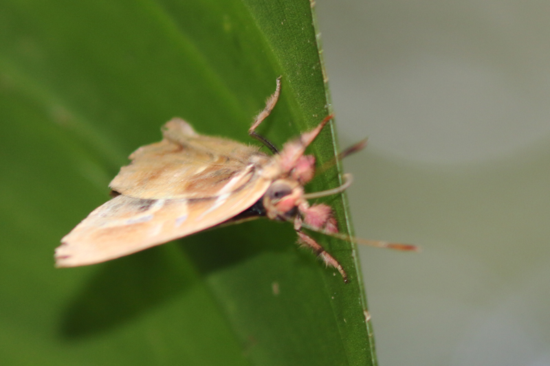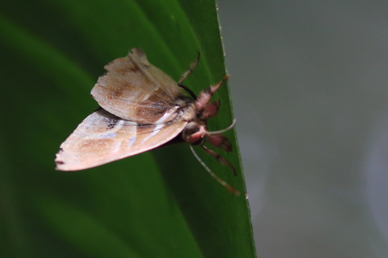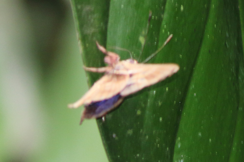 山道を下っていると、アンドリューとこの森のオーナーのフアンさんが樹冠から蝶のトラップを下ろしているところに出くわしました。木の上部にどんな蝶がいるのか興味津々で眺めていると、体毛がピンクのレナルドゥスシジミタテハOurocnemis renaldusがついていました。下に降りてきてくれない蝶もまだまだいるのでしょう。フラッシャーと呼ばれている翅全体がメタリックに輝くアオネオオセセリAstraptesの仲間もたくさん見かけました。翅裏の模様で見分けるのらしいのですがなかなかむずかしいです。