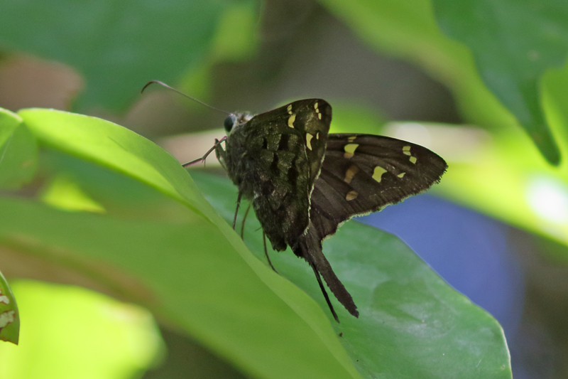 夕方4時のタイムリミットまで蝶の探索は続きます。これまでシジミチョウの仲間が少ないという印象も今日一日で払拭されました。もう一度アグリアスに会いたいという願いは叶いませんでしたが、大満足の一日でした。帰ってからの同定作業は大変そうですが、それも楽しみたいと思います。上の写真の蝶はずっと調べがつかず、蛾の仲間だろうと思っていたのですが、プロカスセセリ Cabirus procasのメスだとわかったときには飛び上がってしまいました。カリュストイデス属セセリCarystoides sp.やメソセミア属シジミタテハMespsemia sp.など同定困難な種もたくさんあります。そのあたりが今後の課題です。(2019/04/16:同定をお願いしていたセセリが、バーナードからの返信でパピアス属の一種Papias sp.ということが分かりました。でもムラサキに輝く種はないらしく、新種かもしれないとのことです)