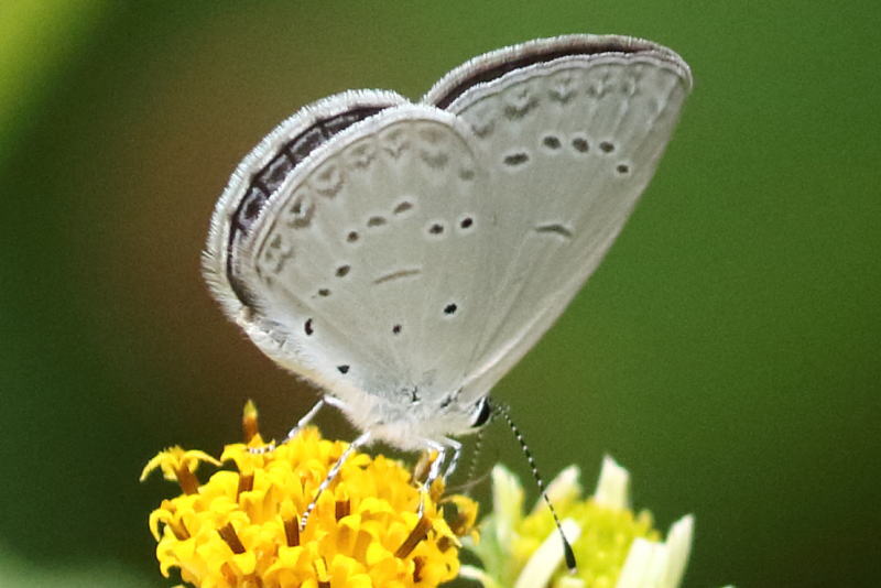 メモmemo : 和名のようにルリシジミによく似ていますが、翅裏肛角付近にハの字型の斑紋はなく、黒点は丸く白っぽく縁取られています。