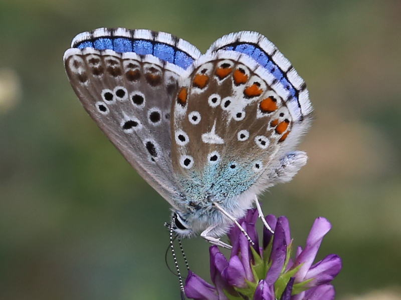 メモmemo : イカルスウスルリシジミPolyommatus icarusと翅裏の模様がそっくりですが、アドニスヒメシジミLysandra bellargusには外縁の白毛に等間隔にくっきりと黒が入るという特徴があります。またオスのブルーの色合いも違います。メスは一般的に翅表が茶色で外縁にオレンジ紋が並びますが、ブルーにオレンジ紋というフォーム(f.eoronus)もあります。こちらはフランスのランプラで見ることができました。