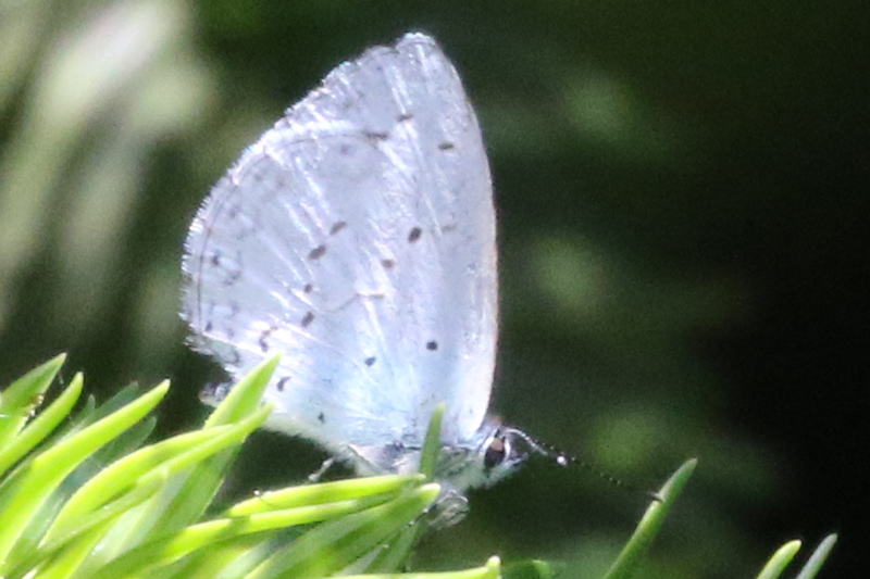 メモmemo : 台湾の碧緑神木で蝶探しをしているとき見つけました。日本のルリシジミとよく似ていますが、翅裏の肛角付近の黒点がV字形に付いていて、胴体付近に青光沢があります。1500m以上の高地に生息しているとのことです。
