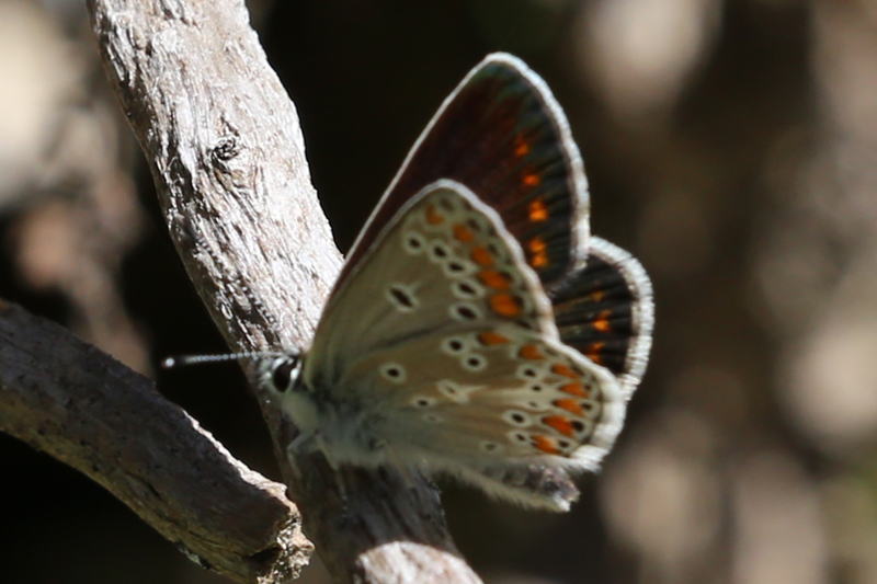 メモmemo : エウメドンシジミEumedonia eumedonによく似てオスも茶色ですが、後翅裏基部に黒点があることで区別できます。翅表外縁のオレンジ紋列はA.agestisに比べて若干内側に並んでいます。アルプス産のssp allousは独立した種とされることもあるようです。フランスアルプスでも出会いました。