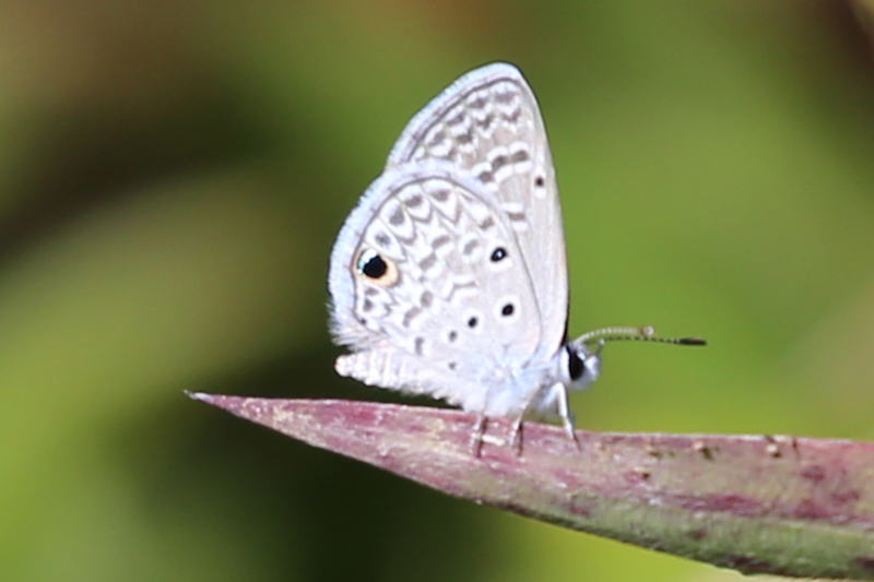 メモmemo : ヤマトシジミZizeeria mahaくらいの大きさのシジミで、前翅外縁の縁取りはやや太く、後翅肛角の黒丸は1つです。