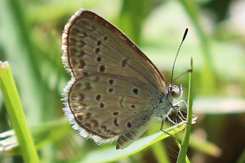 メモmemo : 東南アジアに広く分布しています。ヤマトシジミZizeeria mahaなどとは後翅裏点の配列の違いで判断できますが、白化して点が見えないものもあります。日本では西南諸島にssp riukuensisが生息しています。