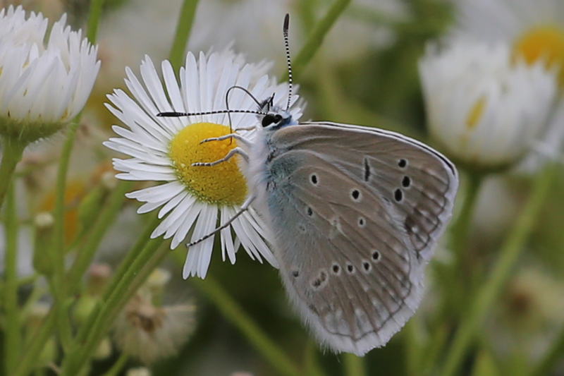 メモmemo : 翅裏はゴマシジミMaculinea teleiusと同じような黒点の並び方ですが、全体に白っぽく外縁の模様なども違います。肛角付近での黒点列の曲がり方が緩やかなのが決め手でしょうか。
