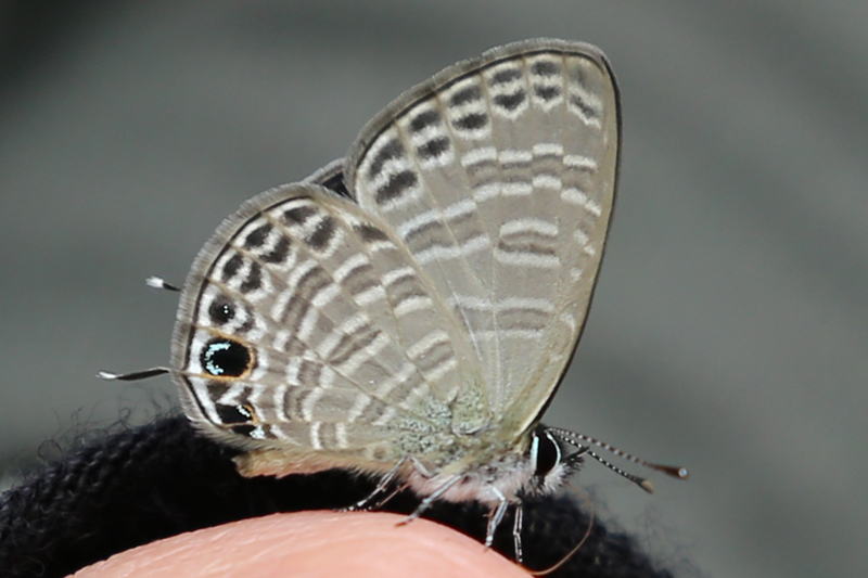 メモmemo : アマミウラナミシジミNacaduba kuravaによく似ていますが、翅表の外縁黒帯が太い点などで識別できます。翅裏だけでの区別は難しいですが、やはり外縁部の地色がかなり黒いようです。人の汗などにも寄ってきます。全く人を恐れていないようでした。