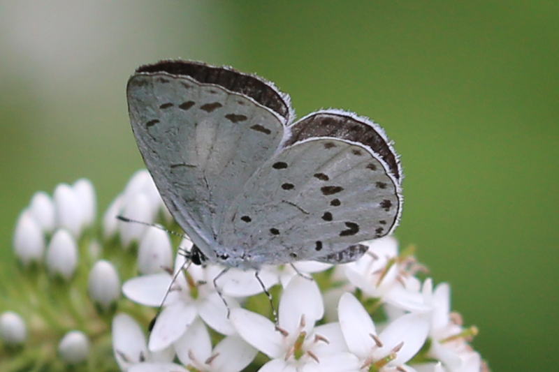 メモmemo : ヤクシマルリシジミAcytolepis puspaやルリシジミCelastrina argiolusにある翅裏外縁の波模様がありません。前翅裏に表の白紋が透けて見えることがあります。