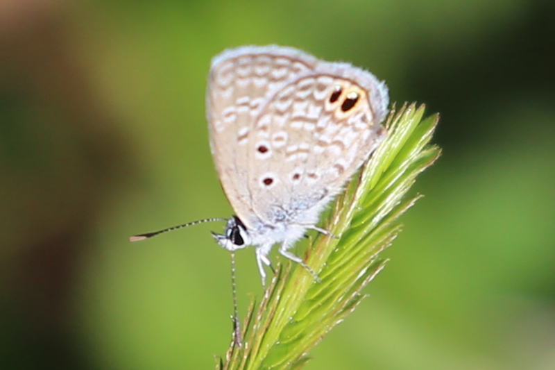 メモmemo : ハンノシジミHemiargus hannoに似ていますが、こちらは後翅肛角に黒丸が2つあります。表のブルーの外の縁取りも狭いようです。