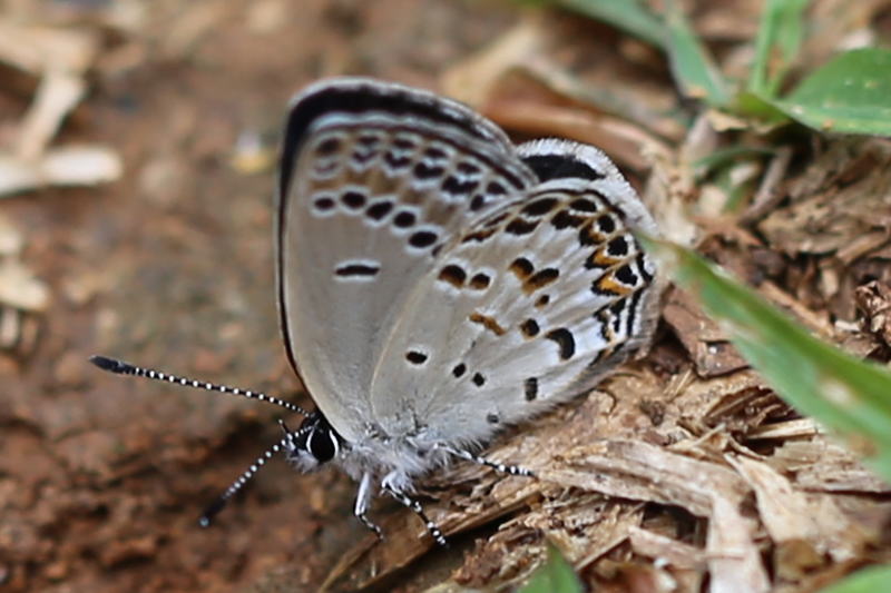 メモmemo : ムシャクロツバメシジミTongeia filicaudisによく似ていますが、前翅裏中室内に黒点が無く、後翅裏の外縁に沿って楔形の連続があるので区別できます。