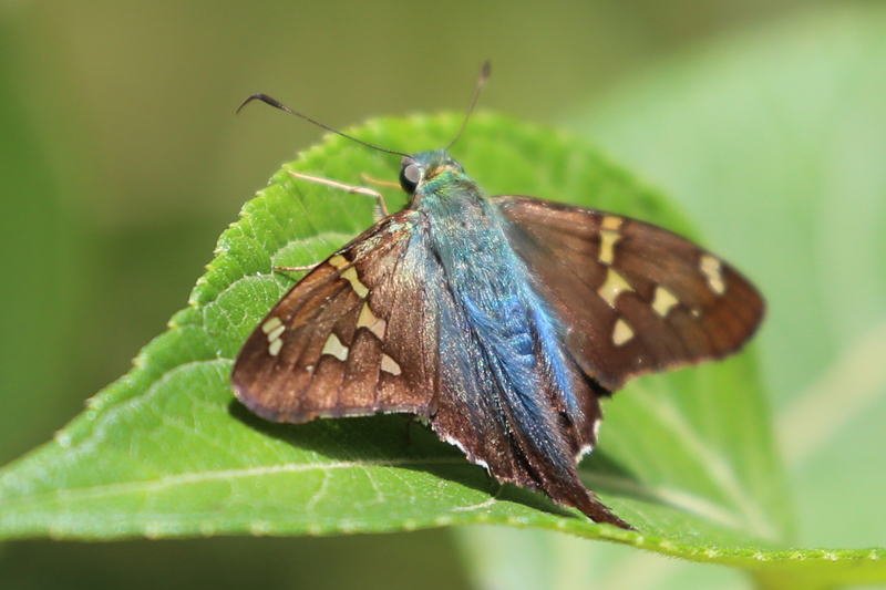 メモmemo : 胴体と翅の基部がかなり青いオナガセセリUrbanusです。前翅には白点がちらばります。