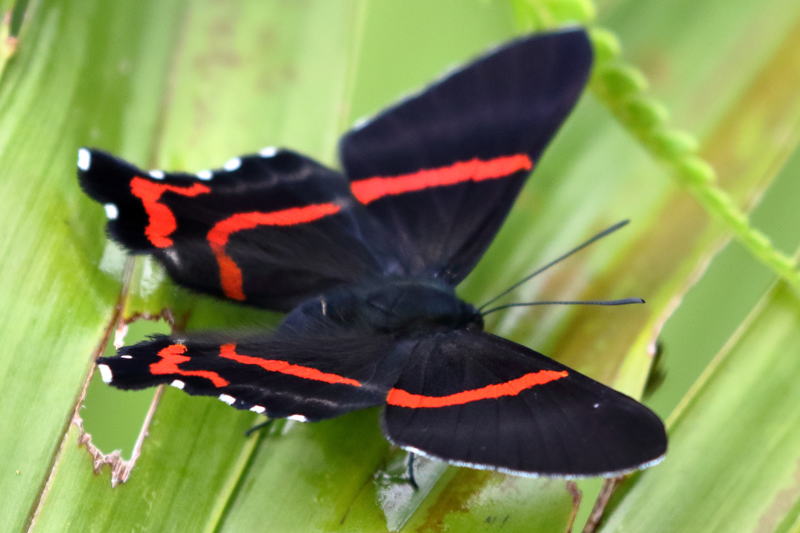 メモmemo : 黒に赤い線というシックな装いです。裏の美しいブルーは、翅を閉じないのでなかなか見ることができません。