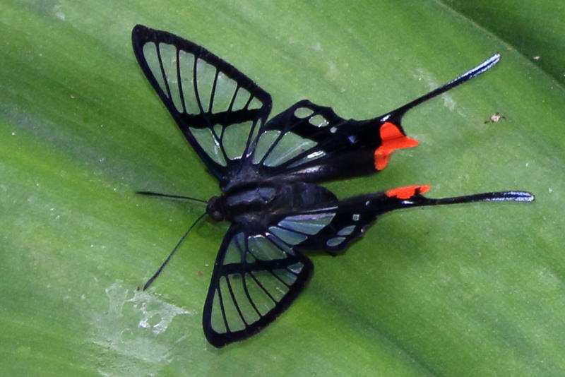 メモmemo : 透明な翅と肛角のオレンジが美しい蝶です。前翅中央に翅脈で三角形ができているのが特徴です。