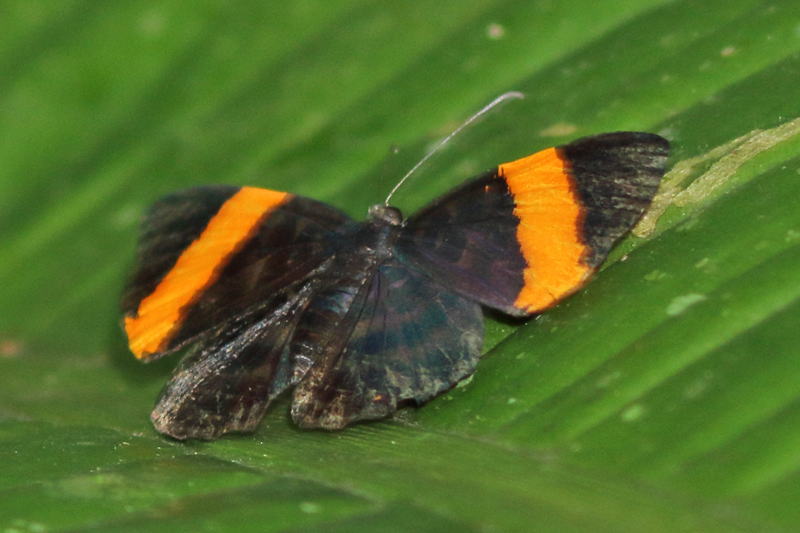 メモmemo : タテハチョウの仲間やシジミタテハの仲間に似ている蝶がたくさんいます。オレンジ帯が前翅後角に届く点や、後翅に裏の模様が透けて見える点などで判断しました。
