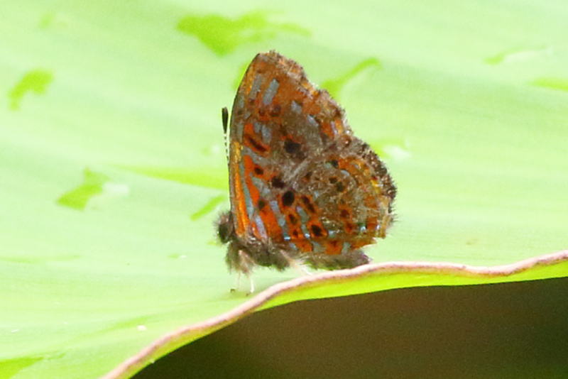 メモmemo : Sarota acantusによく似ていますが、翅裏に黒点が多いなどの違いがあります。大きな葉に止まっていて、その葉が大きく揺れるので、撮影が大変でした。